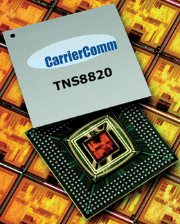 Designed with the end-to-end solution in mind, the TNS8820 includes built-in functions such as bit-error-rate (BERT) and sophisticated clock and data recovery circuitry for user data. Integrated system features such as I/Q mismatch correction and DC offset re-moval simplify system design and reduce overall system costs. Integrating full duplex operation into a single piece of silicon for high speed networks, CarrierComm’s flexible and programmable architecture allows system designers to optimize power consump-tion, symbol rates, and coding/puncture rates, ultimately enabling higher levels of inte-gration and bringing the benefits of Moore’s law to network communications.